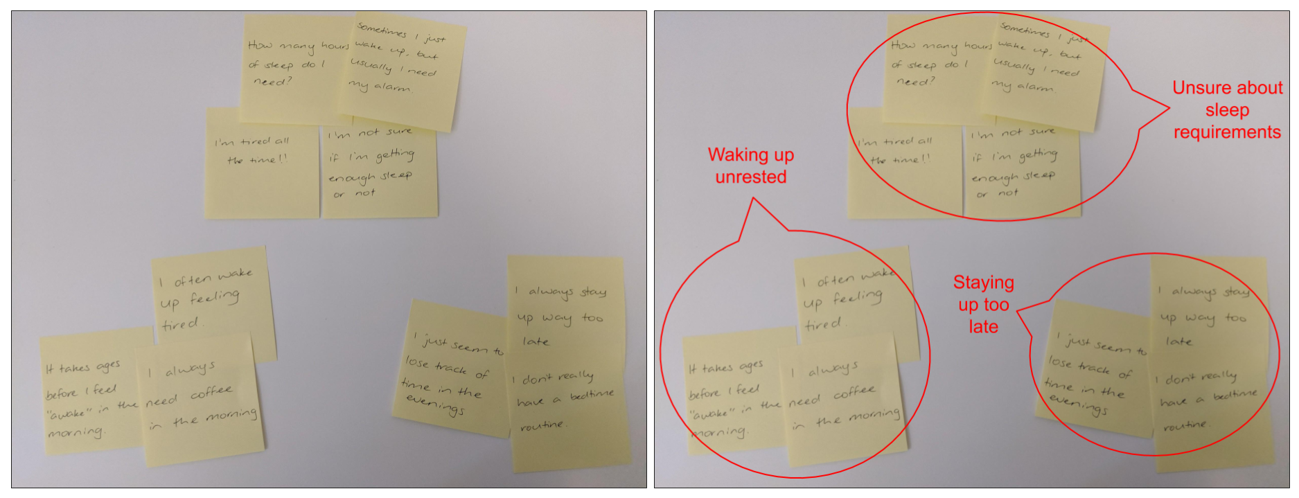 For example, if we had 16 sticky notes under “waking up unrested” and only 5 under “unsure about sleep requirements” and “staying up too late” then we would confidently consider “waking up unrested” to be a high priority concern for our users.